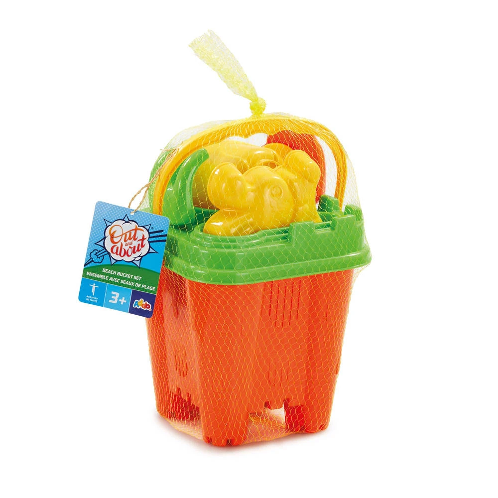 Deze kleurrijke strandemmerset wordt strandklaar geleverd met een zandkasteelemmer, een deksel met zeef, vork, schop, gieter en een diervorm.