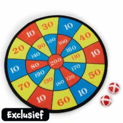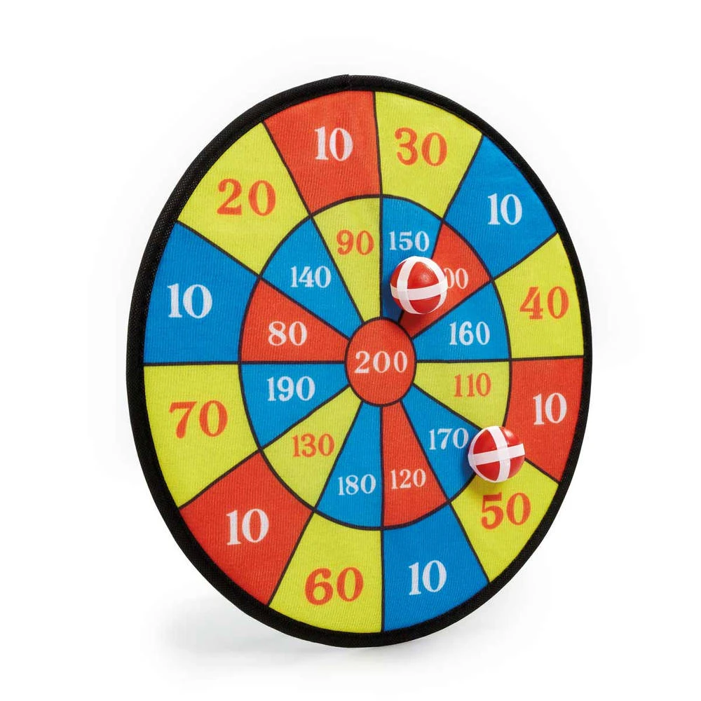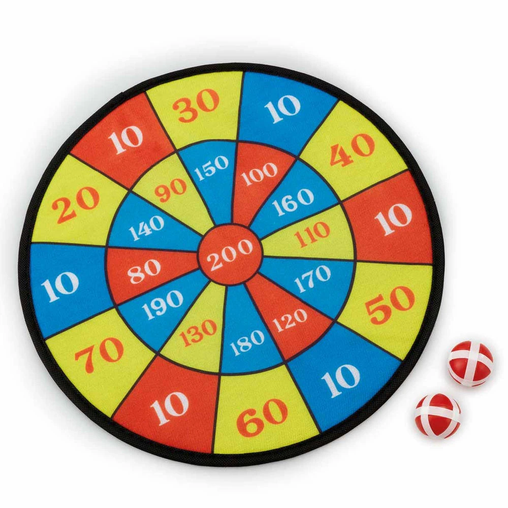 Schiet raak met dit klittenbandwerpspel! Hang het grote stoffen doelwit aan een binnen- of buitendeur of muur en oefen maar raak! Gebruik de twee kleine, met klittenband beklede balletjes of de Velcro dartpijlen voor urenlang eindeloos speelplezier. Nodig vrienden uit voor schietoefeningen en strijd om de hoogste score of kies een nummer en probeer twee secties te raken om zo dicht mogelijk bij het nummer te komen. Wie heeft de hoogste score? Het doelbord heeft een diameter van 36 cm.