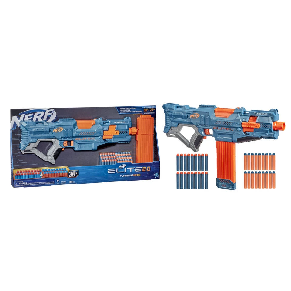 Maak je klaar voor de strijd met NERF Elite 2.0 blasters en hun ingebouwde aanpassingsmogelijkheden om ze te upgraden en de bovenhand te halen tijdens NERF gevechten. Leg een voorraad Elite 2.0 blasters aan om je spelstrategie te optimaliseren en bij alle missies en gevechten je spelstrategie, tactische prestaties en flexibiliteit in te zetten! De NERF Elite 2.0 Turbine CS-18-blaster heeft 4 tactische rails en een bevestigingspunt voor een loop, zodat je hem kunt aanpassen voor elke missie en elk gevecht. Deze gemotoriseerde blaster heeft een magazijn voor 18 darts en vuurt razendsnel als je de acceleratieknop ingedrukt houdt om de motor te starten en vervolgens de trekker overhaalt voor een spervuur.