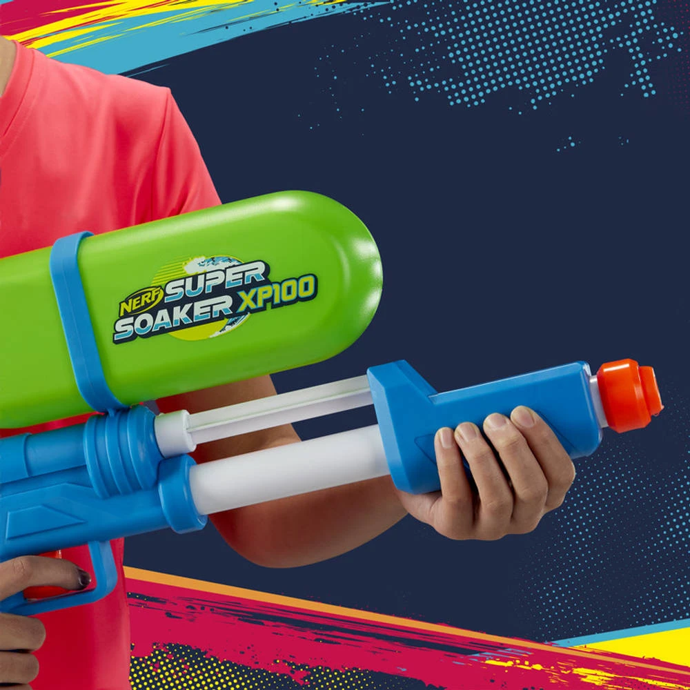 Dit gave NERF Super Soaker waterpistool XP100 is uitgerust met het originele waterlanceermechanisme onder druk, felle retrokleuren en een klassieke vormgeving.