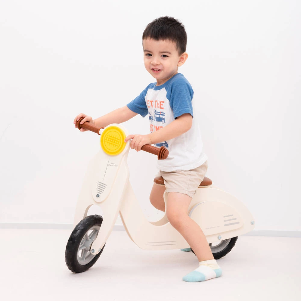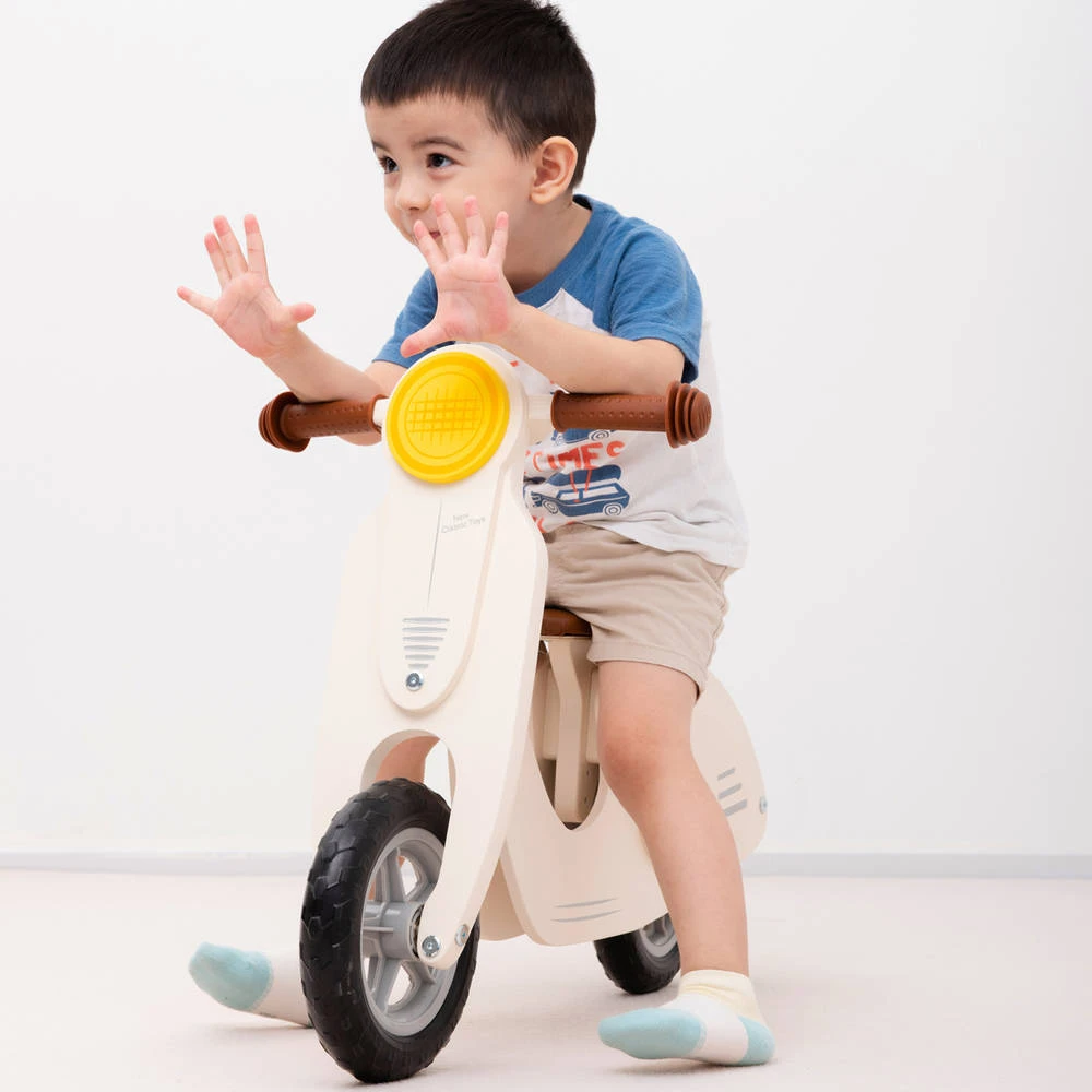 Kinderen kunnen op een veilige manier hun omgeving ontdekken met deze prachtige, witte New Classic Toys houten loopscooter.