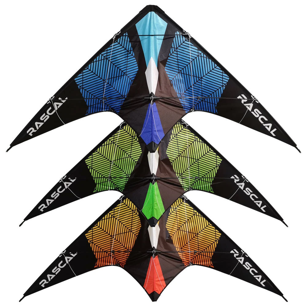 Deze sierlijke Rhombus Rascal vlieger van 164 x 80 cm is geschikt voor windkracht 2 tot 5 en is gemaakt van ripstop nylon.