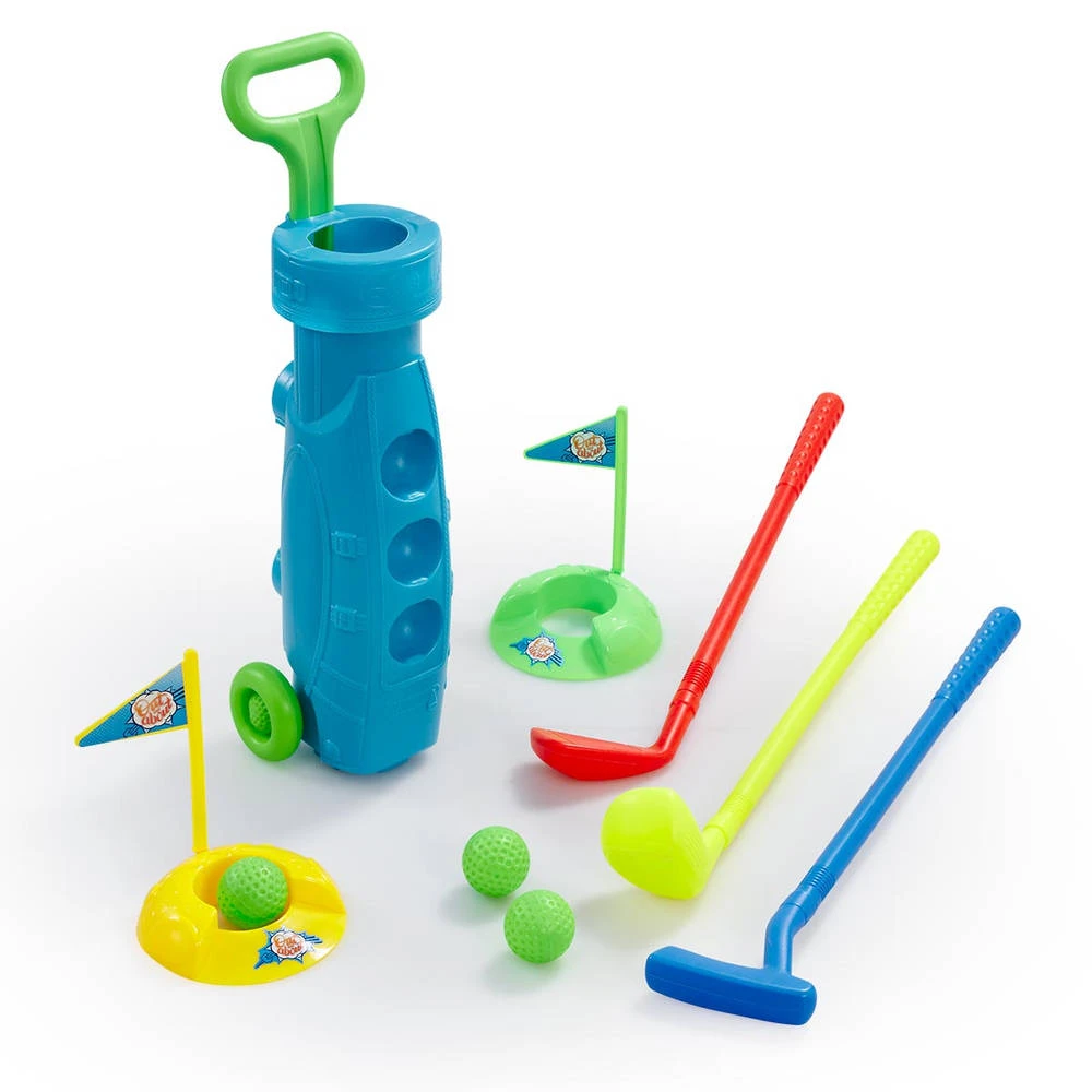 Geweldige Out and About golf caddy set met drie felgekleurde clubs, drie golfballen, twee gaatjes en een wielkast om je hele golfuitrusting mee te nemen.
