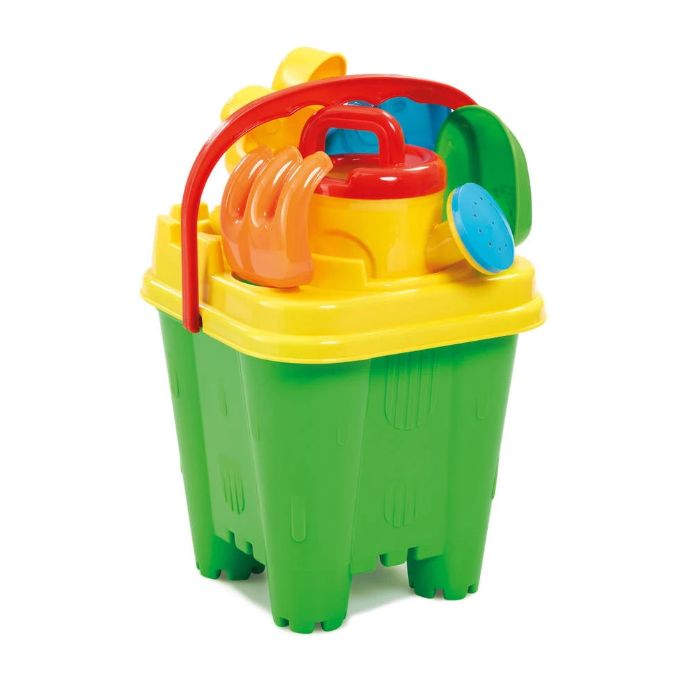 - De set bevat een emmer, twee zandvormpjes, een gieter, een vork en een hark.