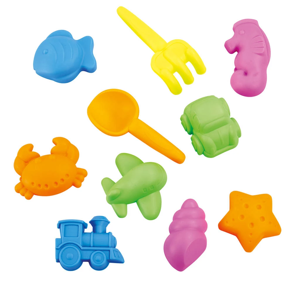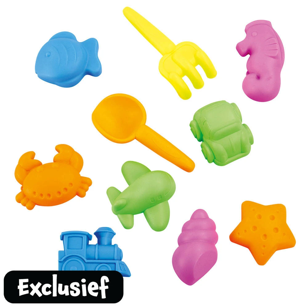 - De set bevat een troffel, een hark, een krab, een zeester, een zeepaardje, een zeeschelp, een vis, een auto, een vliegtuig en treinvormen.