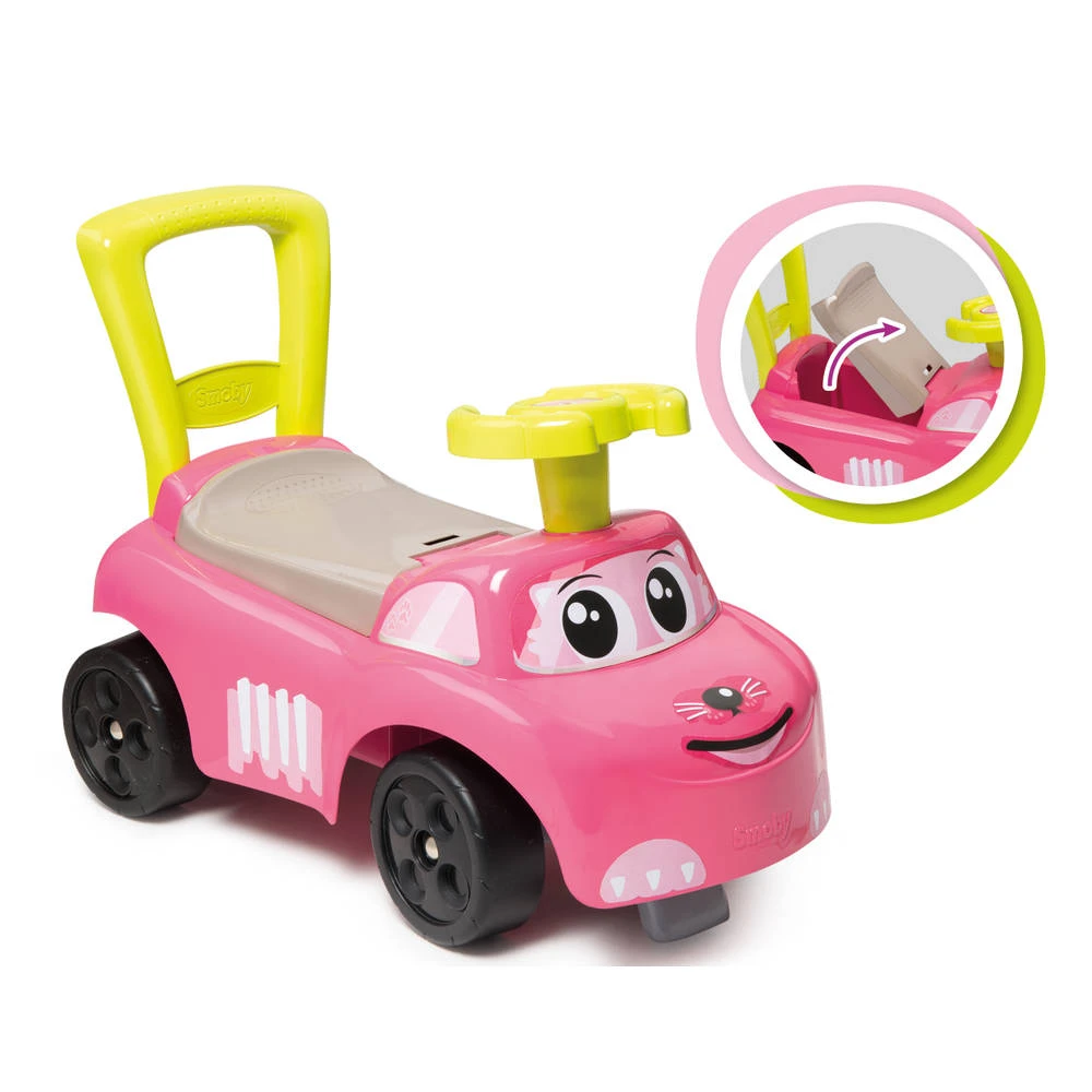 Peuters kunnen hun omgeving verkennen op deze mooie, roze Smoby mijn eerste ride-on loopwagen. De loopauto is voorzien van een vrolijk dierengezichtje.